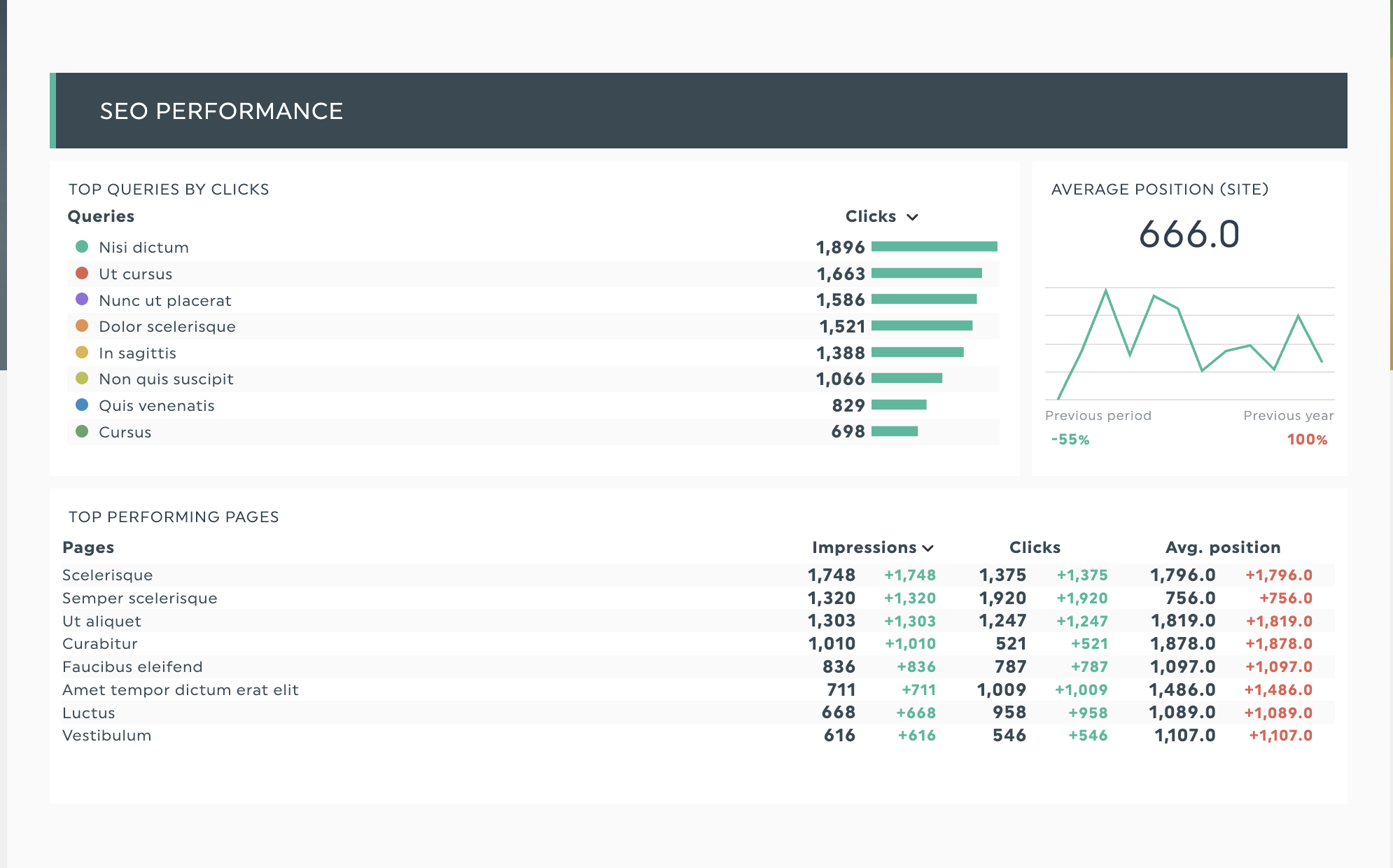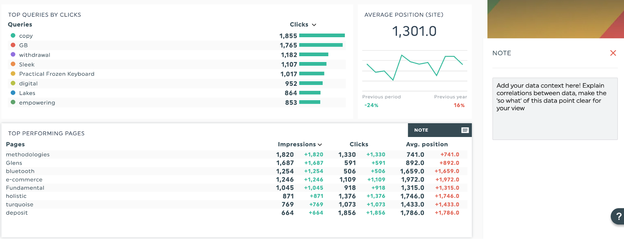 Les présentations de données SEO comprennent souvent de nombreux chiffres et plusieurs indicateurs. Supposons que vous souhaitiez mettre en avant vos meilleures pages d'atterrissage comme candidates idéales pour améliorer la vitesse de chargement. Notre modèle de rapport SEO peut afficher l'évolution mensuelle à l'aide d'un petit tableau indiquant la position moyenne et le nombre de clics.