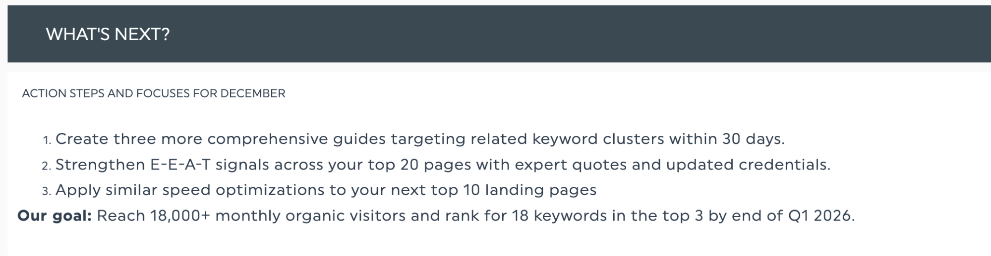Objectif : atteindre plus de 18 000 visiteurs organiques par mois et se classer parmi les trois premiers résultats pour 18 mots-clés d'ici la fin du premier trimestre 2026.
