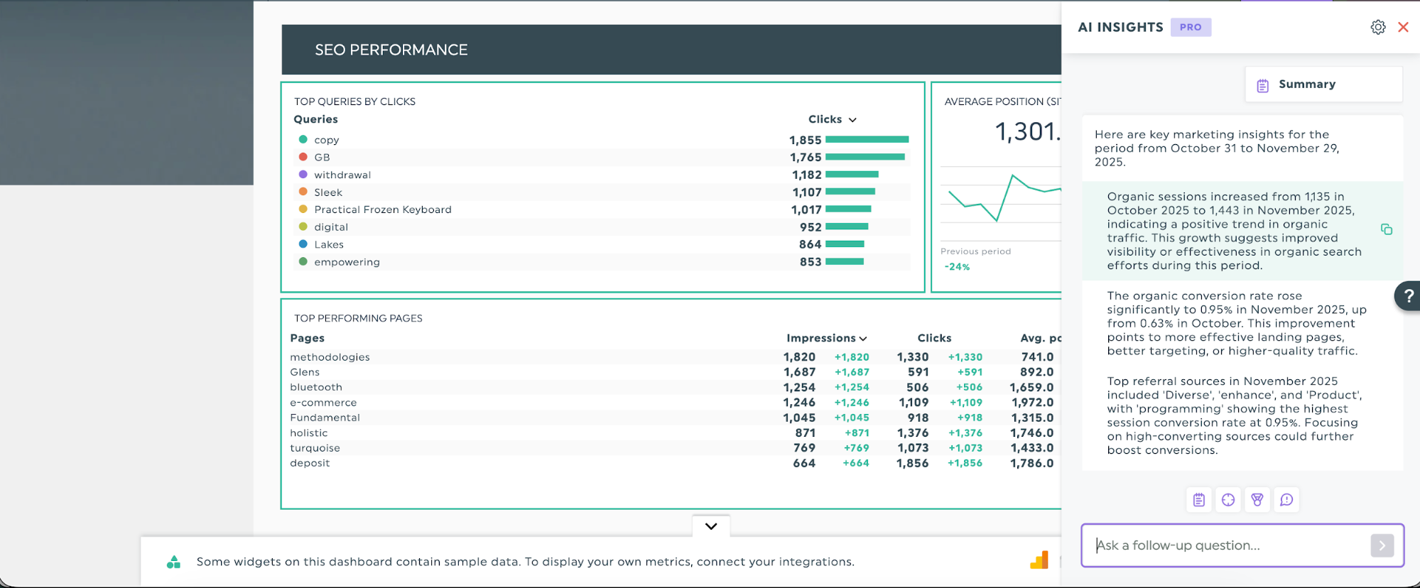 L'IA peut vous aider dans votre analyse en repérant des tendances dans vos données historiques que vous pourriez manquer. L'IA de DashThis pourrait montrer qu'une vitesse de page plus rapide est liée à des taux de rebond plus faibles et à des classements plus élevés, ou que les mises à jour de contenu améliorent régulièrement les positions des mots-clés associés, vous aidant ainsi à confirmer plus rapidement ce qui fonctionne.