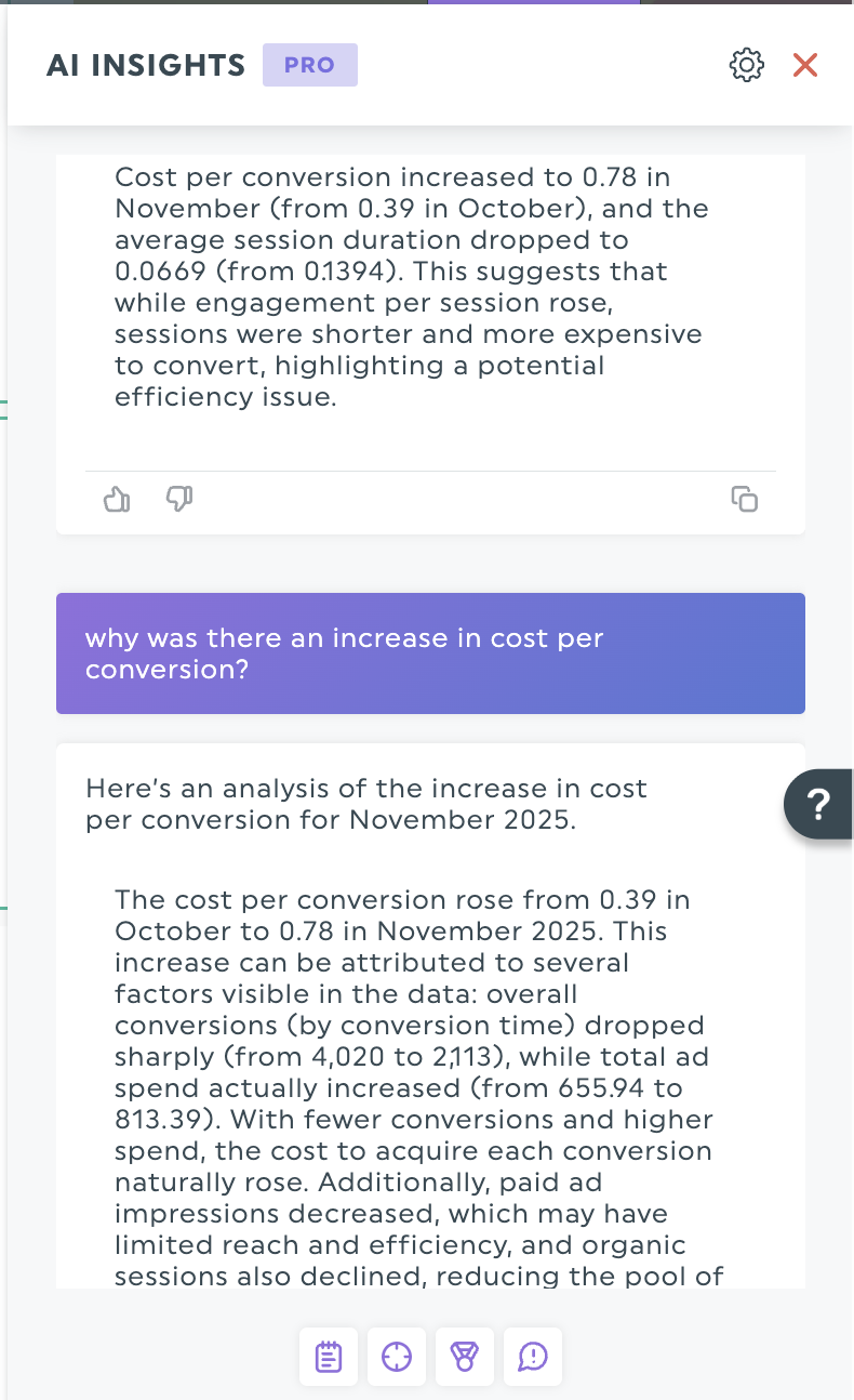 Lorsque ces informations de haut niveau soulèvent de nouvelles questions, AI Insights Pro vous permet de discuter avec l'IA pour explorer les détails. Si le résumé montre une augmentation du coût par conversion, vous pouvez demander à l'IA d'analyser plus en détail cette tendance.