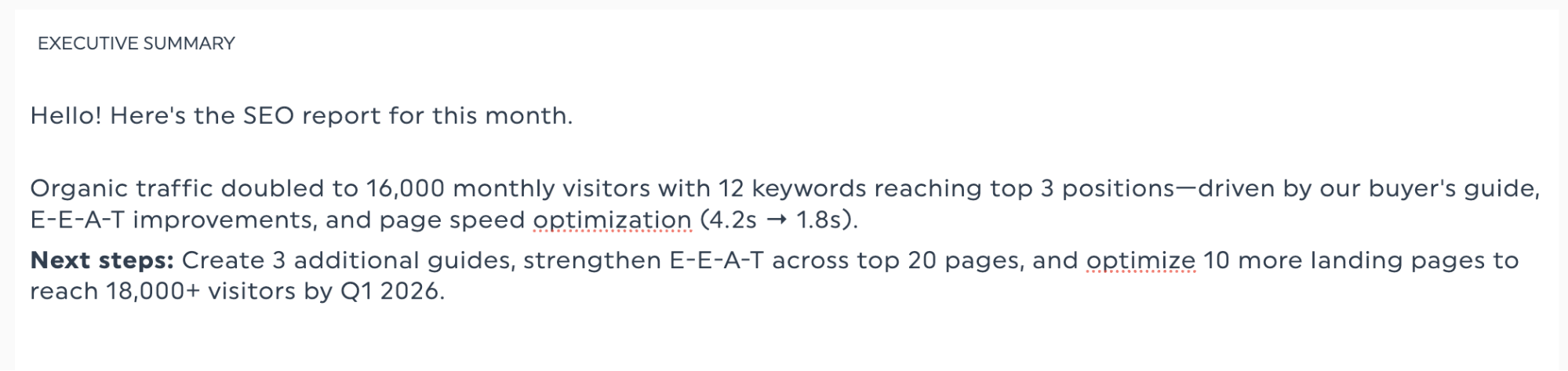 À l'étape 4, nous avons analysé les données SEO à l'aide de trois questions clés : que s'est-il passé, pourquoi cela s'est-il produit et que faire ensuite ? Maintenant, attribuons chaque réponse à l'endroit qui lui correspond dans votre rapport.
