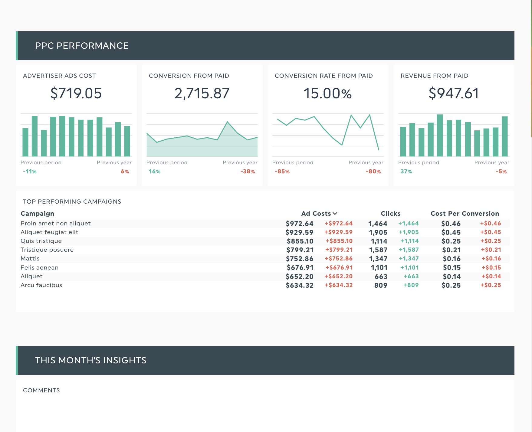 Si les commentaires et les widgets de texte vous permettent d'ajouter votre interprétation d'expert, les informations fournies par l'IA de DashThis peuvent accélérer le processus. Par exemple, la lentille « Résumé » fait rapidement ressortir les points marketing clés pour votre période de reporting, afin que vous puissiez vous concentrer sur l'essentiel.