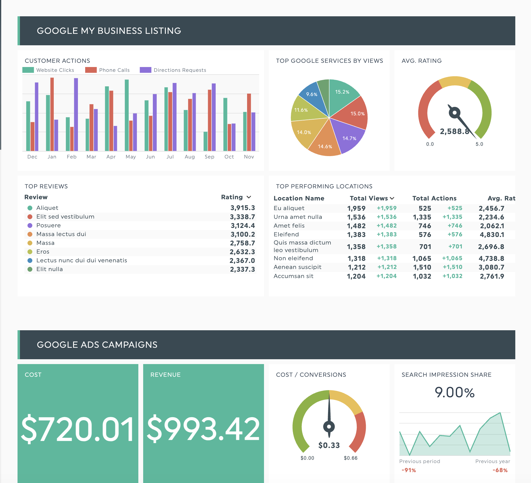 Ce modèle relie les indicateurs en ligne aux résultats concrets en suivant les consultations du profil Google Business, les classements dans les recherches locales et les demandes d'itinéraires, parallèlement aux performances de votre campagne numérique. Il est idéal pour les agences qui gèrent des entreprises locales et qui ont besoin de prouver et d'optimiser le retour sur investissement du marketing numérique et de la visibilité dans les recherches locales.