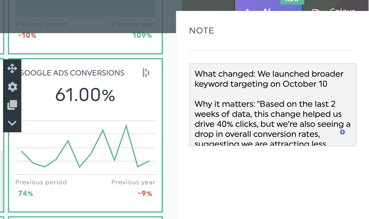 Par exemple, si vous expliquez une baisse du taux de conversion dans les derniers résultats Google Ads, vous devrez expliquer ce qui a changé, pourquoi cela est important et ce que vous comptez faire ensuite. Voici comment vous pourriez présenter les choses :