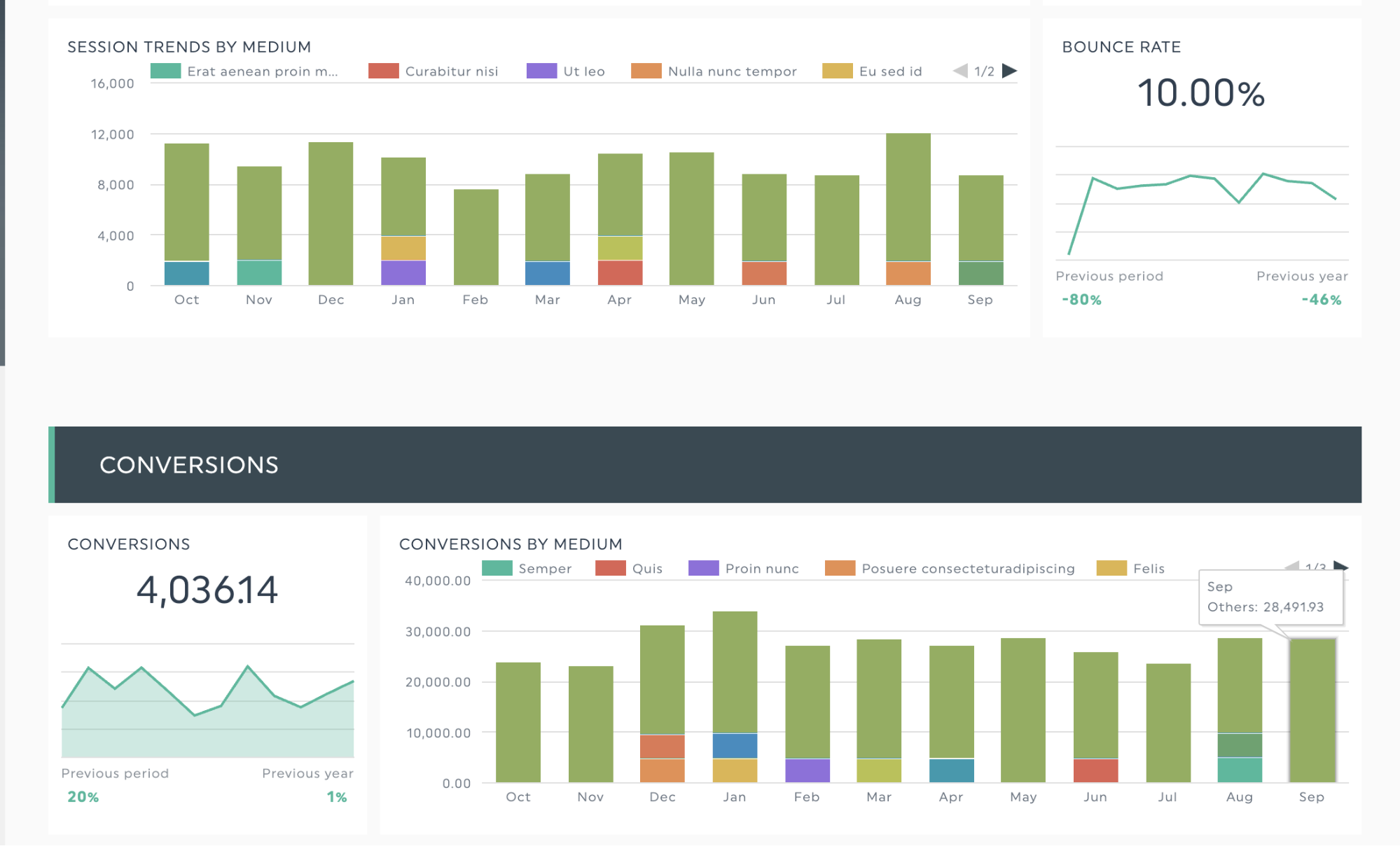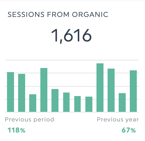 Ici, un diagramme à colonnes empilées décompose les totaux en éléments et suit les changements à travers les périodes de temps. Ce format permet d'afficher efficacement des mesures de référencement telles que le pourcentage de trafic organique ou le nombre total de conversions à partir de sources organiques sur plusieurs mois. La comparaison claire entre les périodes peut vous aider à montrer l'impact de vos résultats en matière de référencement et à renforcer votre argumentaire lors d'un examen de la campagne du client.