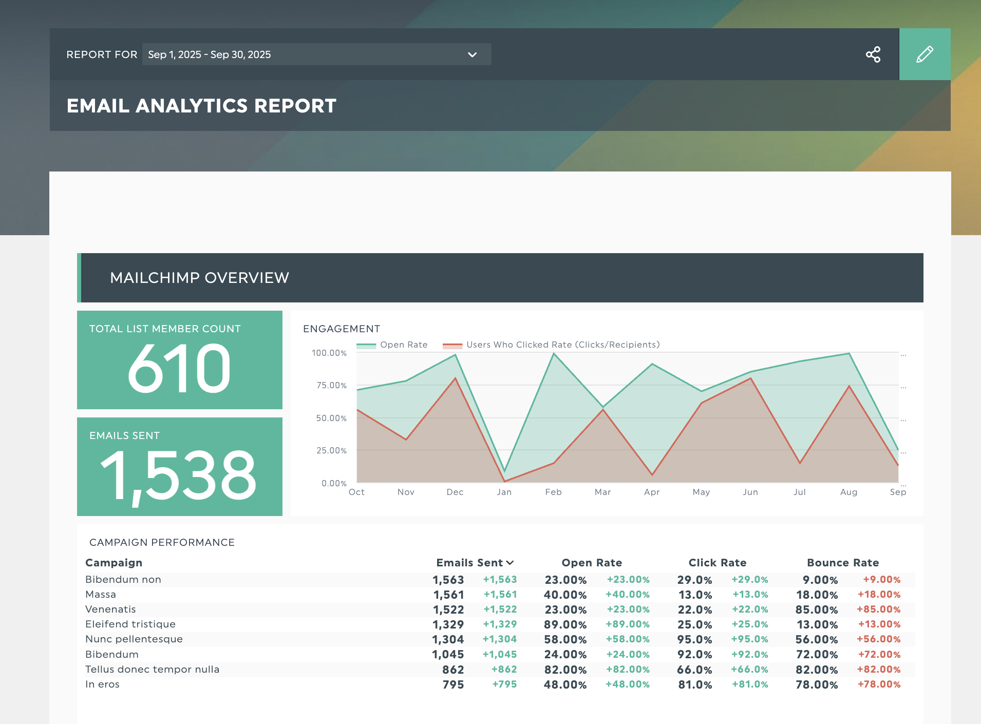 Les rapports de marketing par courrier électronique présentent à la fois des chiffres bruts (taille de la liste, ouvertures, clics) et des pourcentages (taux d'ouverture, taux de rebond). Pour déterminer si vos lignes d'objet doivent faire l'objet d'un test A/B, reportez votre taux d'ouverture et votre taux de clics (CTR) sur un graphique linéaire afin de repérer les tendances dans la manière dont les abonnés interagissent avec vos courriels.