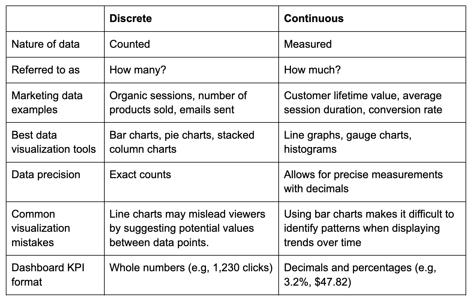 Choisir la bonne visualisation pour votre type de données permet d'éviter la confusion chez le client et de renforcer la confiance dans votre expertise analytique. Utilisez ce tableau récapitulatif pour identifier rapidement la différence entre ces types de données.