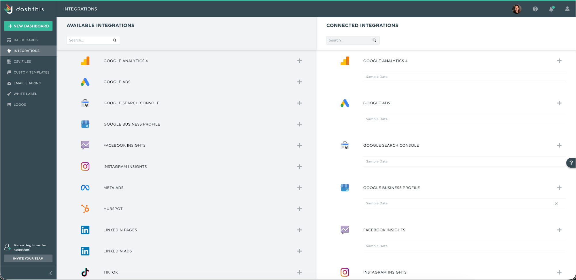 Ou vous pouvez laisser DashThis se charger du travail fastidieux. Connectez vos plateformes une seule fois, et vos données s'affichent automatiquement dans des tableaux de bord prêts à être présentés. Finis les marathons d'exportation, de copie et de collage.