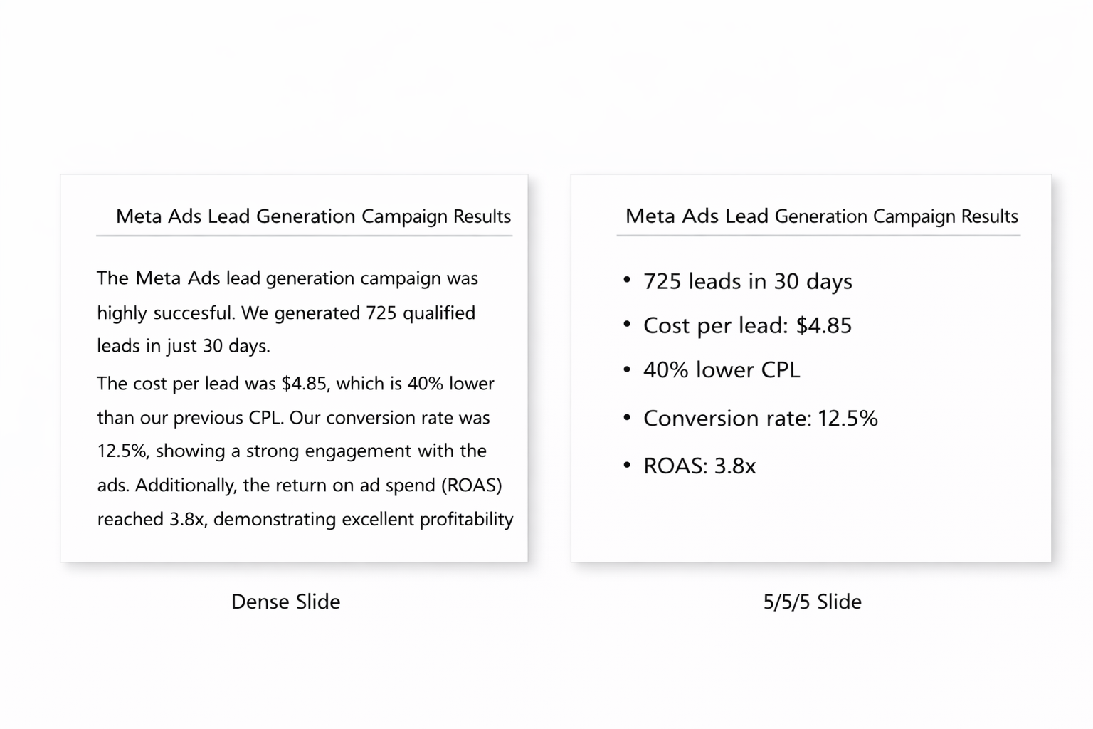 Chaque diapositive doit répondre à une seule question. Pour les performances publicitaires sur Facebook, utilisez une diapositive pour le ROAS et une autre pour le coût par acquisition, plutôt que de tout regrouper dans une seule diapositive.