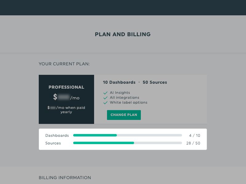 Cette mise à jour introduit une tarification basée sur les sources, ce qui signifie que les forfaits reflètent désormais à la fois les sources de données que vous connectez et les tableaux de bord inclus.